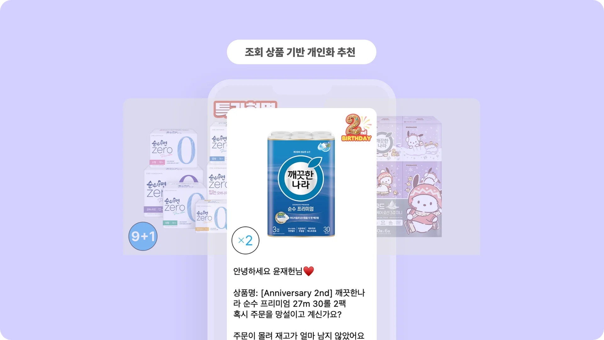 액션: “곧 다 쓰실 시점이에요” 메시지 + 동일/구매 연관 제품 추천